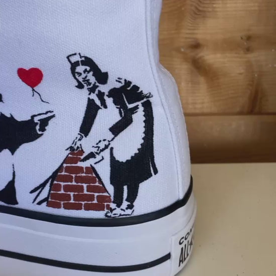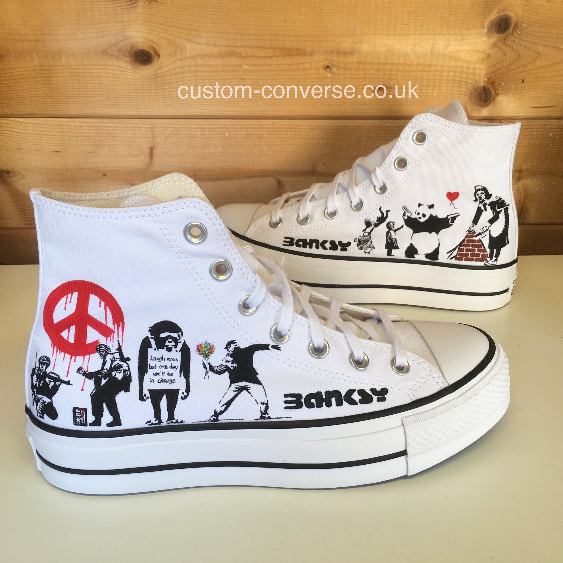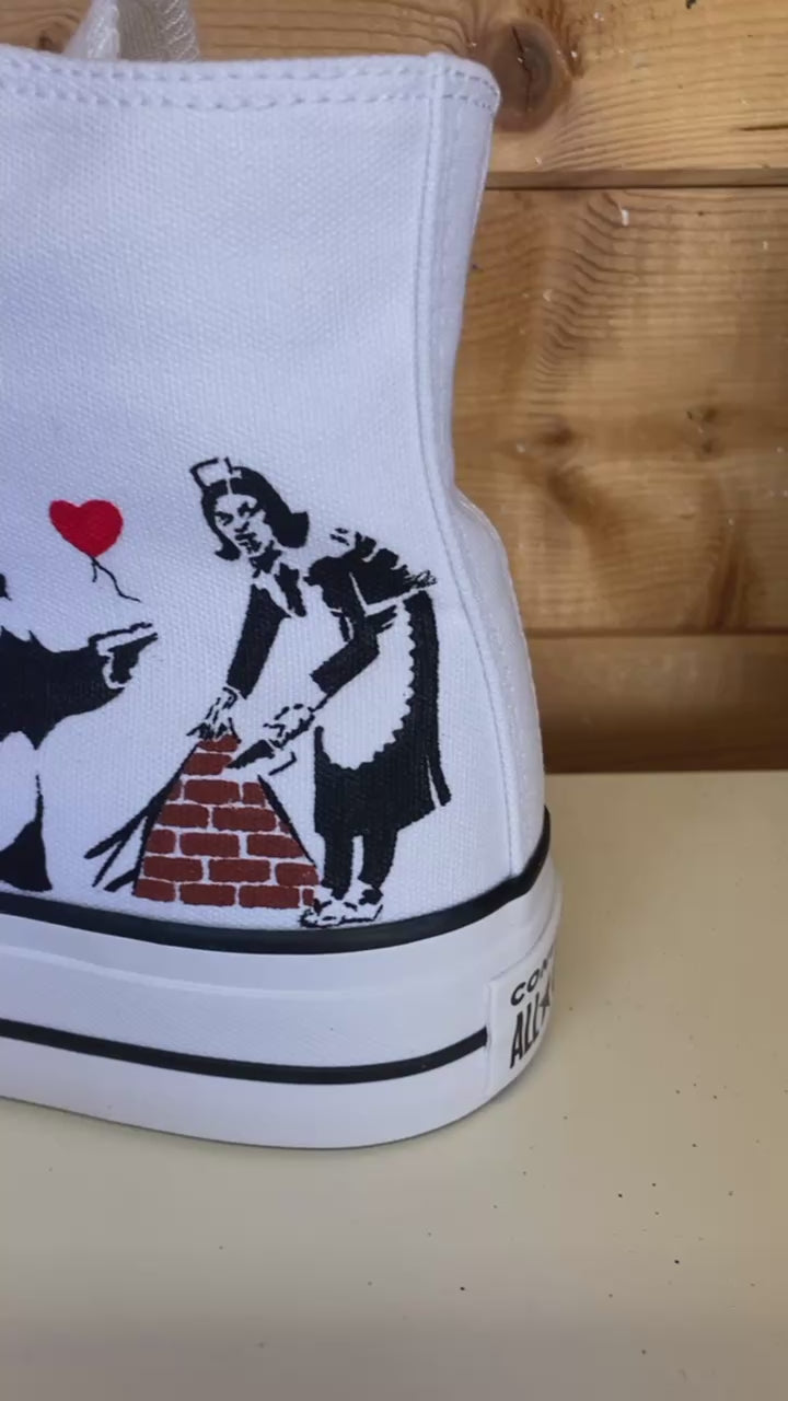 Make a bold statement with these exclusive Banksy Collage Platform Converse. Hand-painted high-top trainers that blend iconic street art with timeless Converse design. Featuring a dynamic collage of Banksy's most famous works, including Balloon Girl, Flower Thrower, and CND Soldiers, these custom shoes turn your footwear into wearable art.
