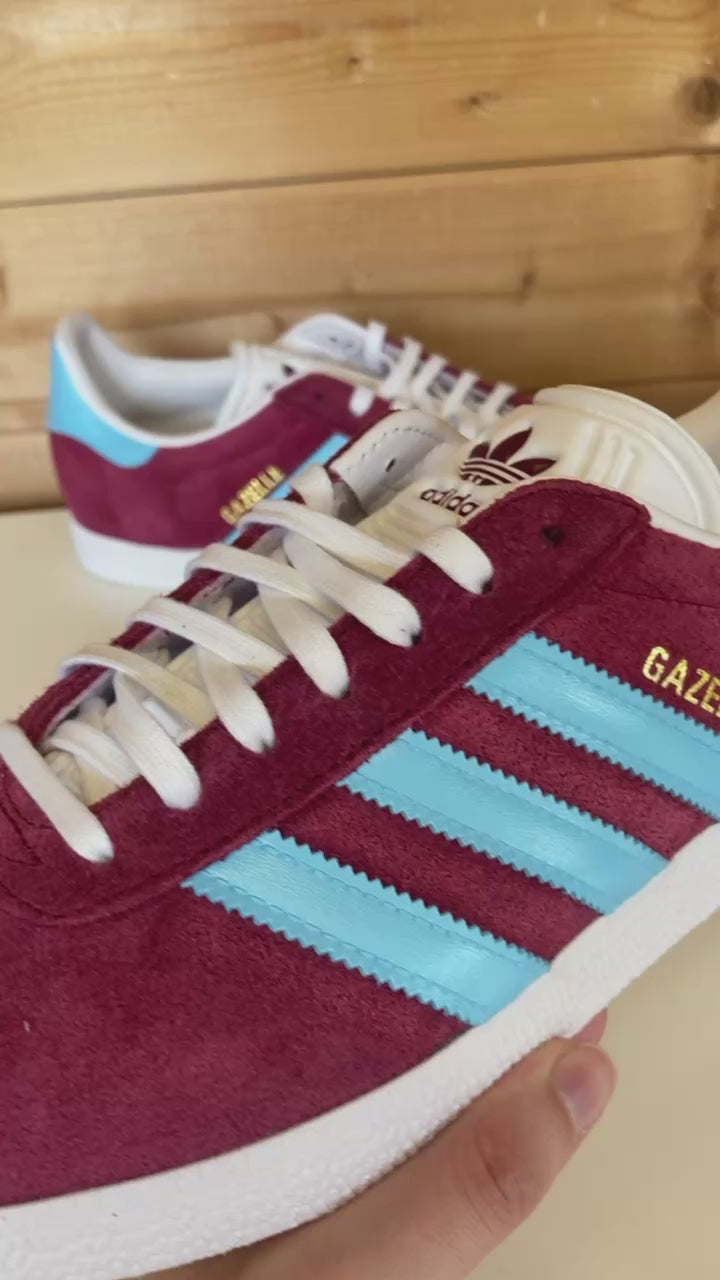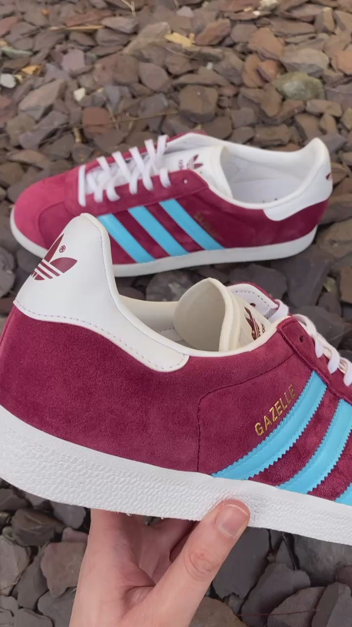 Our Claret and Blue Adidas Gazelle trainers are custom hand painted shoes created for football fans who want to show their team allegiance in style. Built on the classic Adidas Gazelle Originals silhouette, these trainers feature bold claret and blue detailing that makes them perfect for the terraces as well as everyday wear. The standard design includes crisp blue stripes on the sides, but you also have the option to personalise your pair with lettering, making them even more unique.