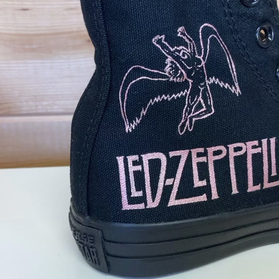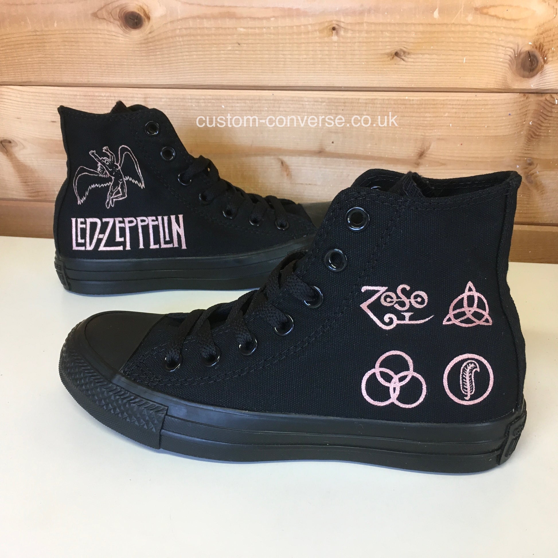 Our Led Zeppelin Converse are custom hand painted trainers inspired by one of the greatest rock bands of all time. Available on either the Classic Converse or the premium Chuck 70 silhouette, and in both high or low top options, these shoes give you the freedom to choose the style that best suits your wardrobe. The design features the iconic Led Zeppelin lettering, painted by hand in the colour of your choice. The product images show the artwork in crisp white and silver, but bold red and other shades can be requested to make your pair stand out even more.