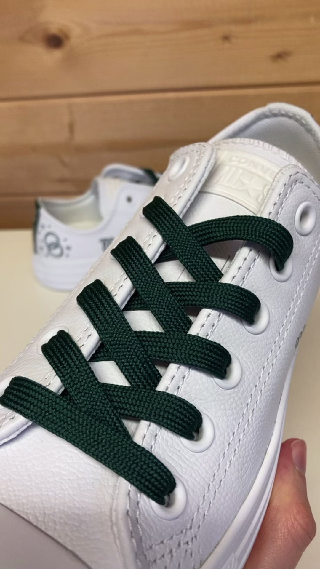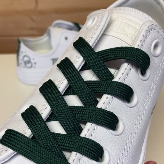 Our Linked Rings Leather Wedding Converse are custom hand painted trainers designed to bring comfort, elegance and personality to your big day. Painted on classic leather low top Converse, the design features two beautifully interlinked rings surrounded by delicate hearts positioned near the heels. This leaves space on the outer or inner sides for you to add your new married name, wedding date or a short personal message.