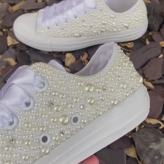 Created using a mix of beautifully sized pearls and crystals, the Mixed Pearl and Crystal Covered Wedding Converse are designed to bring timeless elegance and comfort to your wedding day. Each pair is hand crafted using ivory or white pearls in different sizes, offset with a touch of sparkle from your choice of coloured crystals. The combination creates a stunning textured effect that catches the light beautifully with every step.