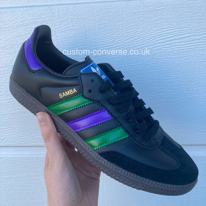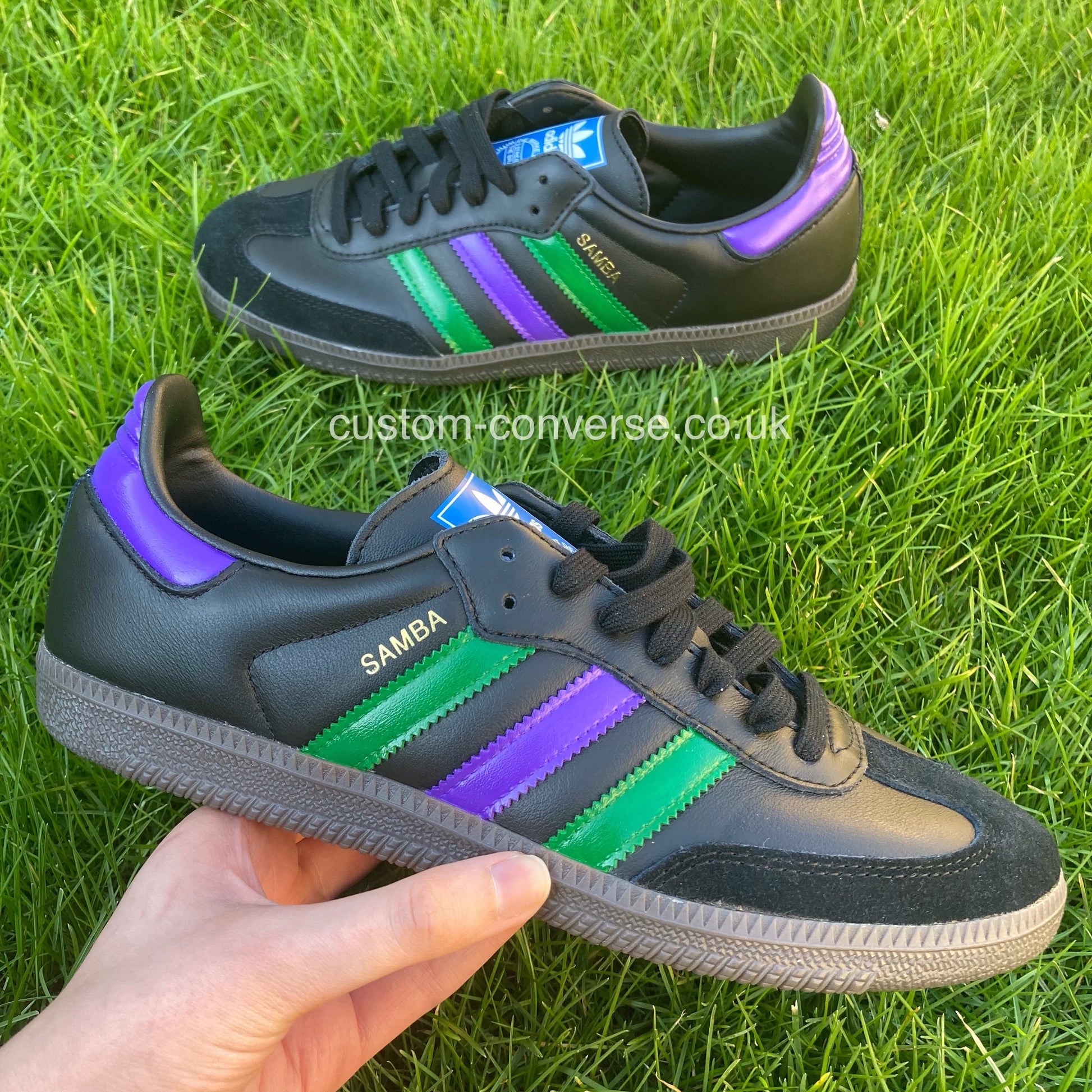 The Grass Slam Samba is a pair of custom Adidas trainers hand painted with a striking tennis inspired design. Available in both black and white, these trainers feature the iconic Adidas Samba silhouette with its timeless low profile and classic styling. Each pair is customised with bold purple and green side stripes and a matching painted heel panel, giving a fresh and sporty look that stands out while still keeping the clean Samba feel.